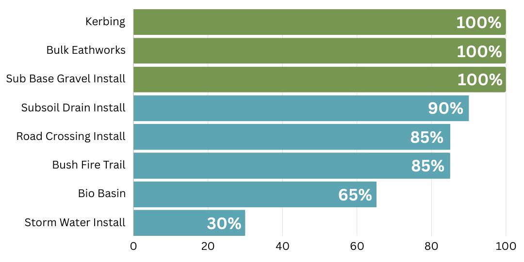 We are thrilled to share the latest on-site updates! Stage 2 and 3 civil works are well underway, with kerbing, bulk earthworks and sub base gravel install now 100% complete. The upcoming weeks promise a flurry of activity, as essential elements like base gravel, asphalt, watermain, topsoil, turf, seeding, bollards, and road signs will commence.